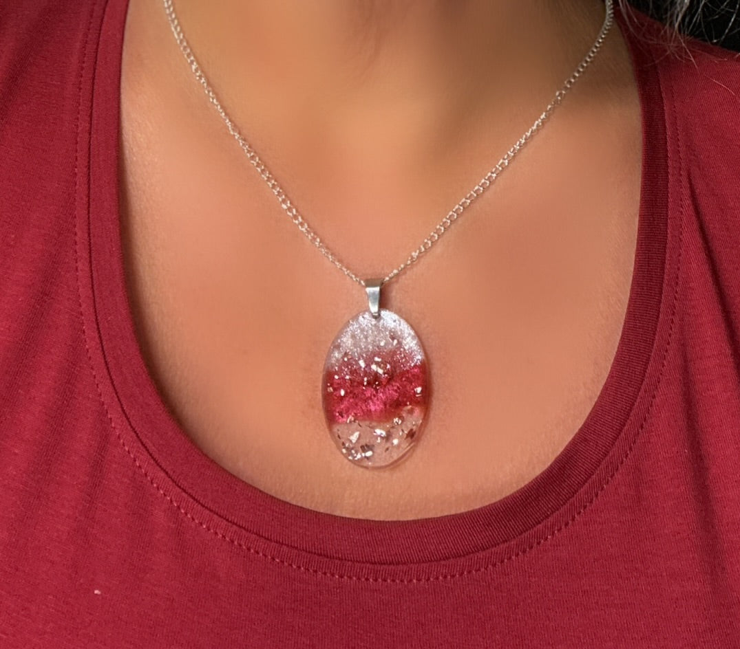 Burgundy white glitter Oval earrings and pendant with Silver Chain